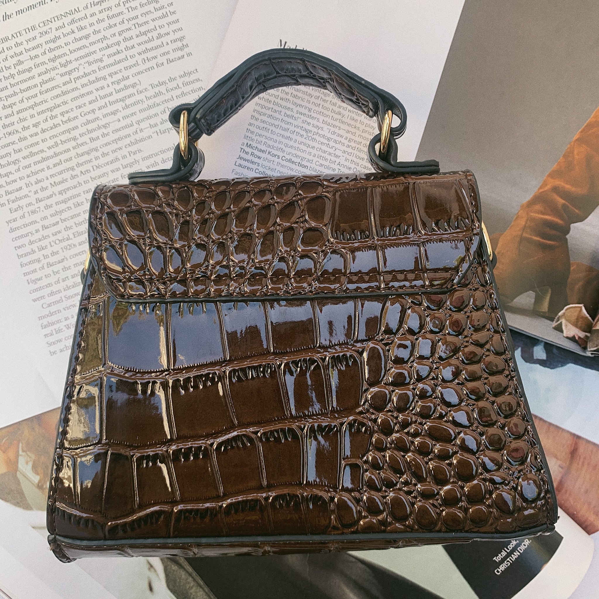 A cute, little, dark brown, faux crocodile leather handbag with a trapezoid structured body, top handle, flap top closure, one pocket right under the flap, with a matching adjustable, faux leather shoulder strap.